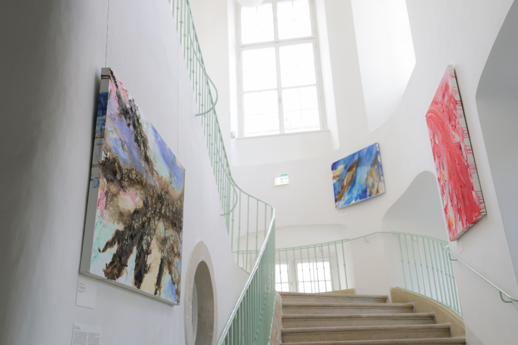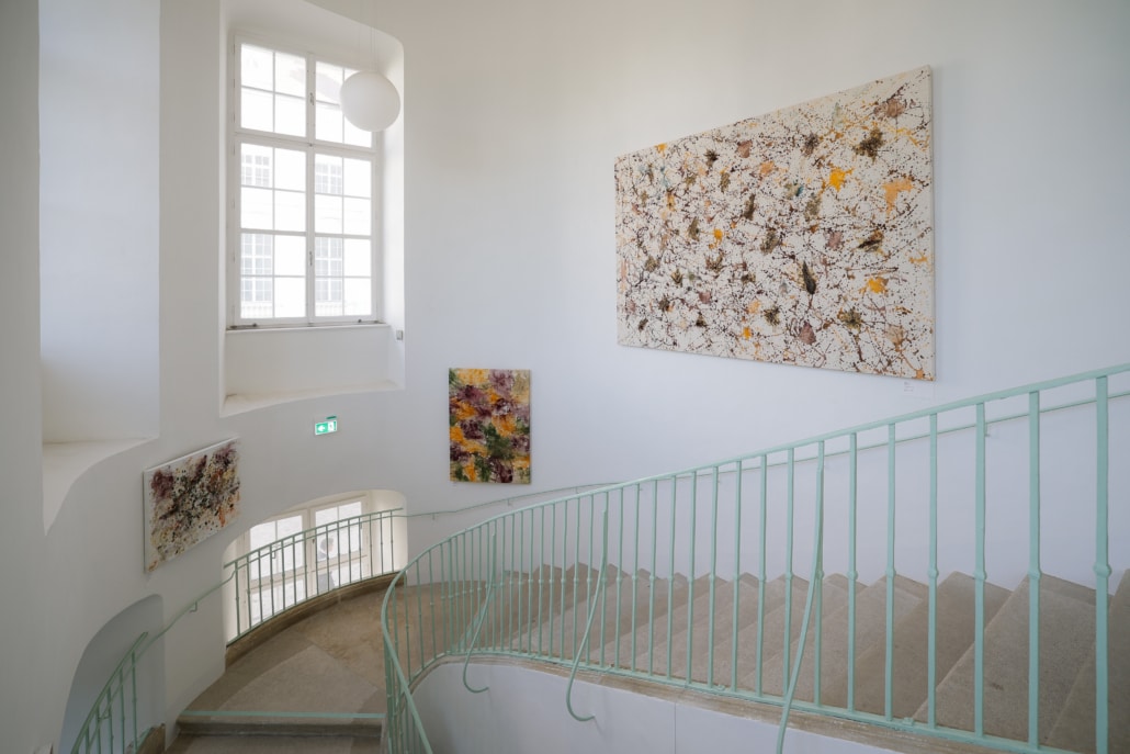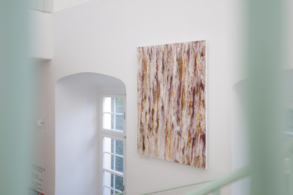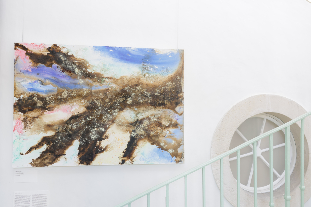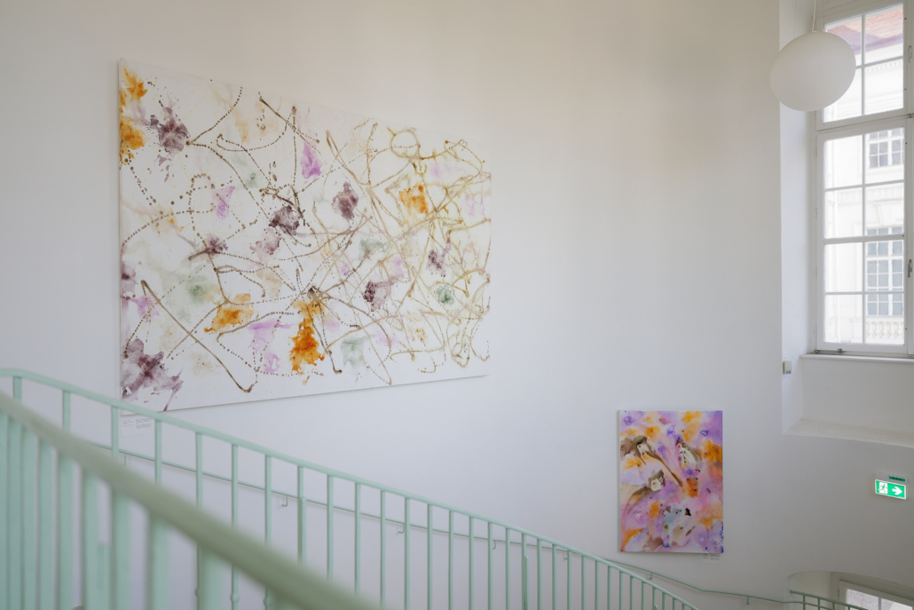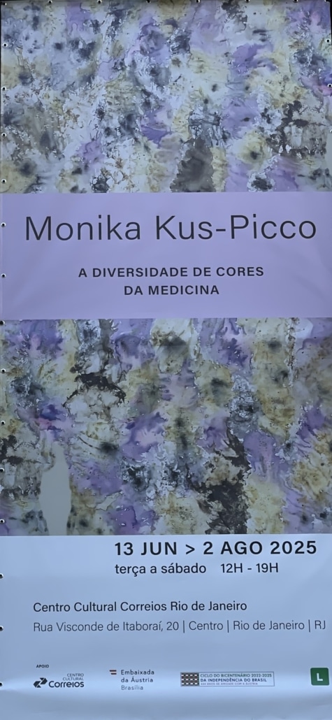 „Monika Kus-Picco (geb. 1973 in Wien, lebt und arbeitet in Wien und Rio de Janeiro). In ihren großformatigen, sogenannten Medizinbildern arbeitet die Künstlerin mit Substanzen der Pharmaindustrie und macht diese erfahrbar. Entscheidend für Kus-Piccos Medizinbilder ist die Wahl der Medikamente. Aus ihnen gewinnt die Künstlerin den Stoff ihrer Farben. Antiseptikum, Neuron, Overdose oder auch Toothache und Familypack lauten Titel aus der Werkreihe. Die Sogwirkung der Malereien auf ihre Betrachter*innen wird unterstützt durch die olfaktorische Wirkung der Farb-Medikament-Gemische. Der Pinselstrich und Farbauftrag auf den Großformaten erinnert an kosmische Prozesse und biochemische Explosionen. Ob ein Malaria-Medikament oder Antidepressiva – Kus-Picco verwendet und recycelt abgelaufene Substanzen in traumhafte Abstraktionen, die einem Humanismus der gegenseitigen Fürsorge huldigen.“ (Distanz Verlag)